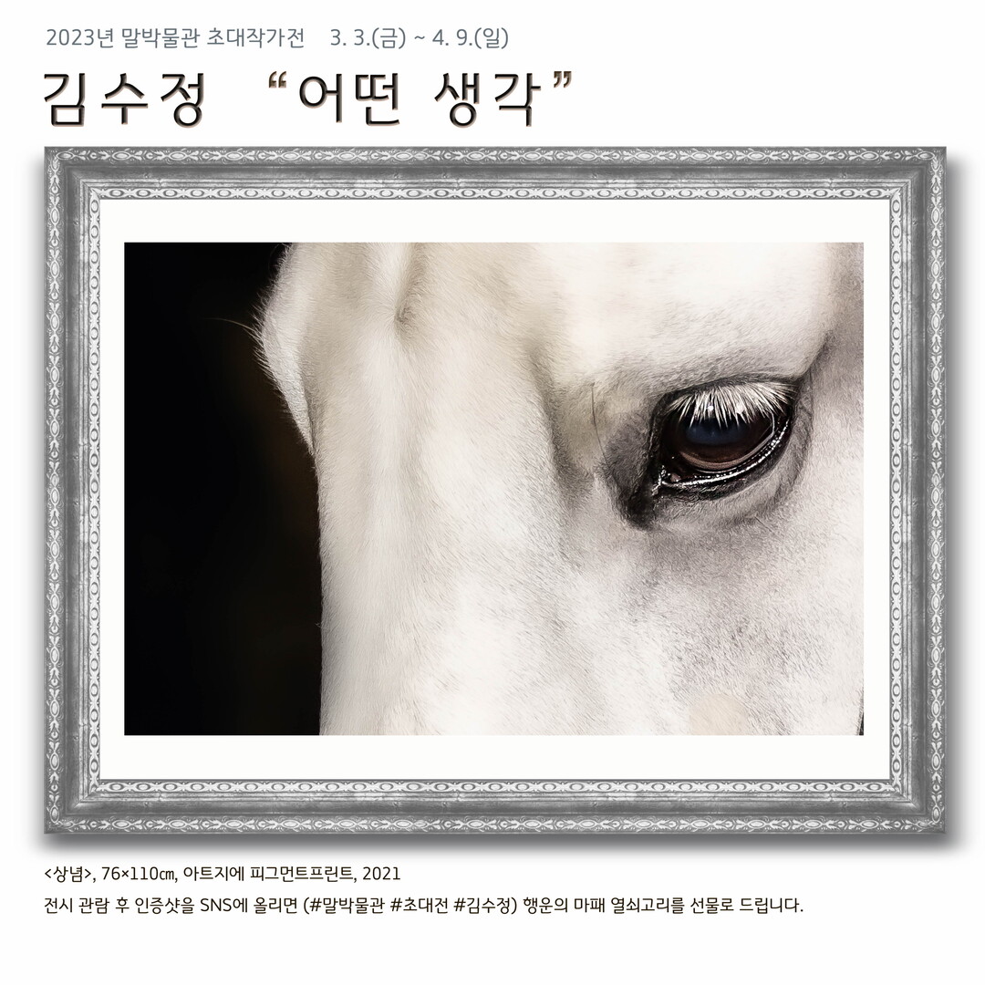 한편 김수정 작가의 ‘어떤 생각’ 전시는 오는 4월9일까지 렛츠런파크 서울에 위치한 말박물관 기획전시실에서 관람할 수 있다. 관람시간은 오전 10시부터 오후 5시30분까지이고, 매주 월요일은 정기 휴관이다.