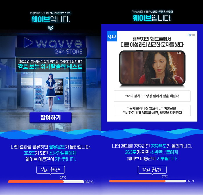 오는 31일까지 진행되는 이번 캠페인은 참여자들이 테스트 결과를 소셜미디어에 공유하고, 공유온도가 36.5도에 도달하면 퇴직 소방공무원 및 가족들에게 웨이브 이용권을 증정하는 방식으로 진행된다.