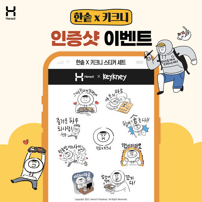 김효신 한솥 마케팅본부장은 “앞서 공개된 한솥x키크니 인스타툰은 물론 키크니 작가 인스타그램 계정에서 진행한 한솥도시락 댓글 이벤트에서 고객의 뜨거운 반응을 확인했다”며 “이번 이벤트를 통해 특별 제작한 스티커를 받고, 추가로 경품 당첨의 행운까지 누리시길 바란다”라고 말했다.