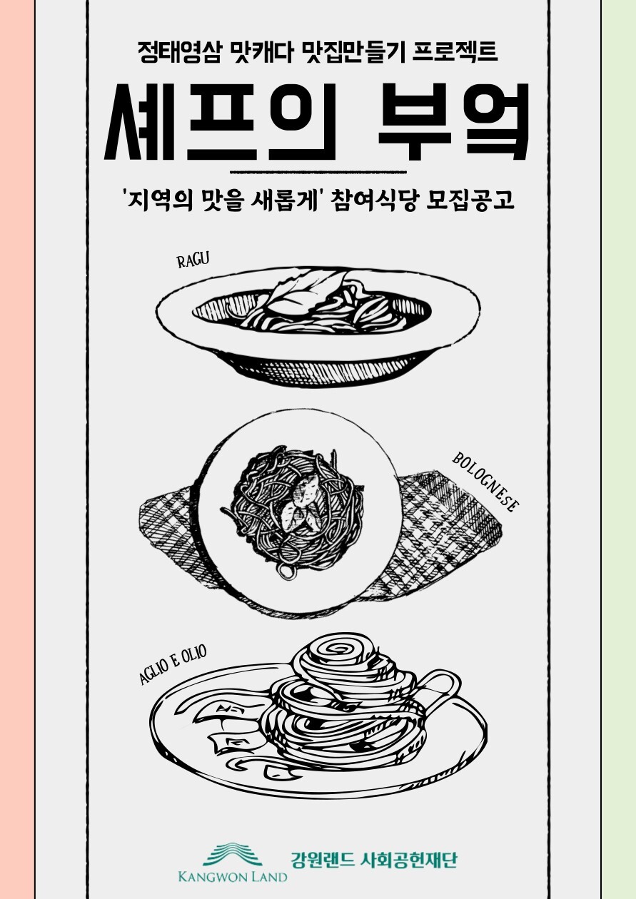 올해 새롭게 추진하는 ‘셰프의 부엌:지역의 맛을 새롭게’는 폐광지역 영세식당 자립지원 사업인 정태영삼 맛캐다의 맛집 만들기 프로젝트로, 강원랜드 각 분야 직원들이 재능기부를 통해 외식업과 홍보에 대한 노하우를 전수한다.