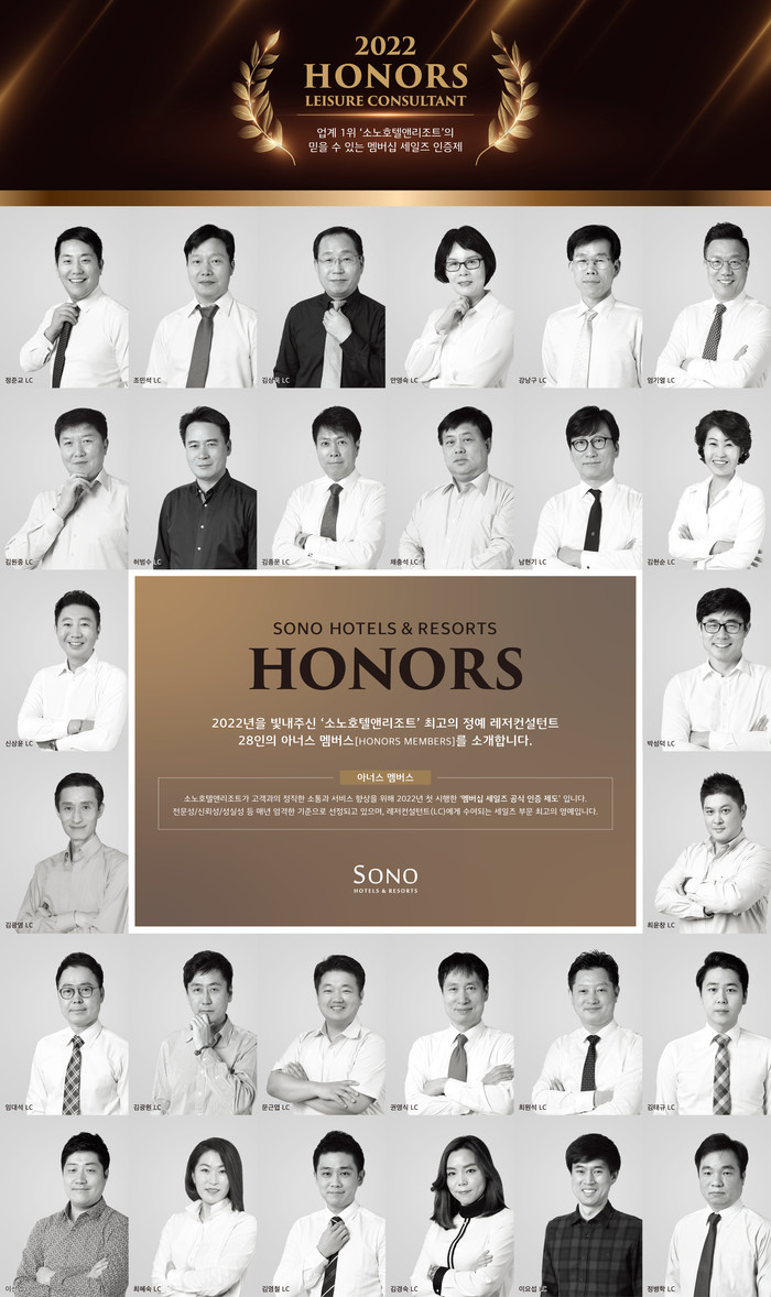 소노호텔앤리조트가 업계 최초로 시행한 ‘아너스 멤버’ 제도는 멤버십 최고의 세일즈 전문가에게 수여하는 공식 인증 제도다.