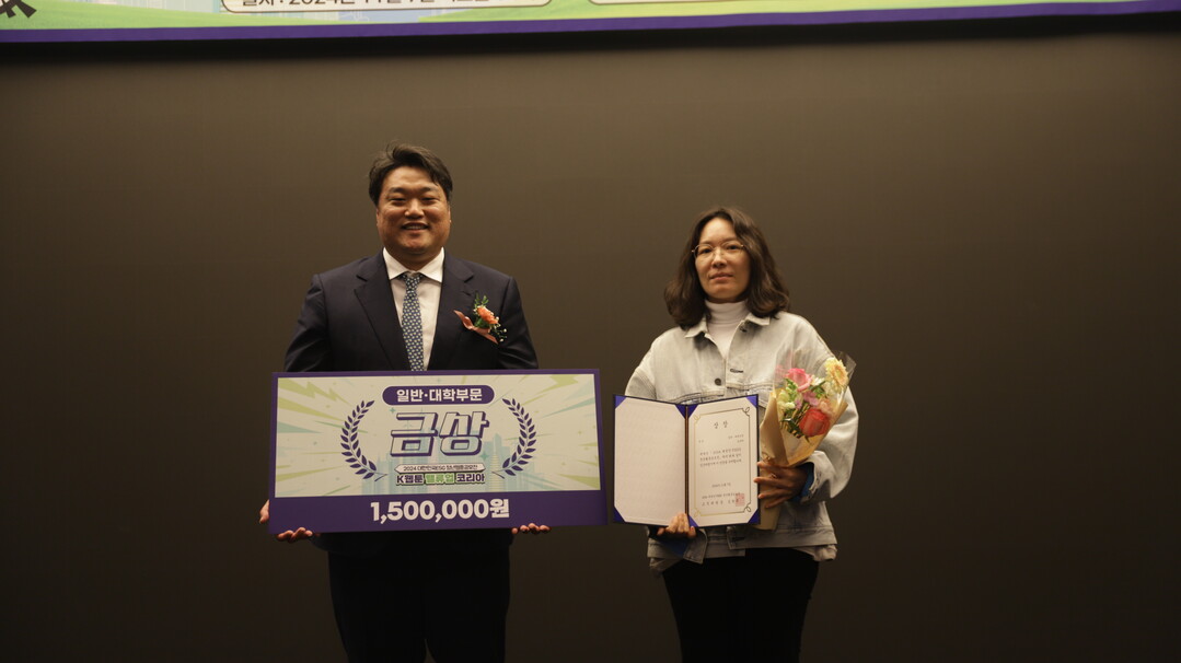 | 7일 오후 2시 서울 상암 스탠포드호텔에서 열린 ‘제1회 2024 대한민국 ESG 청년웹툰 공모전’ 시상식에서 유호연 소셜밸류 발행인과 일반·대학 부문 김유라 금상 수상자가 기념촬영을 하고 있다. |