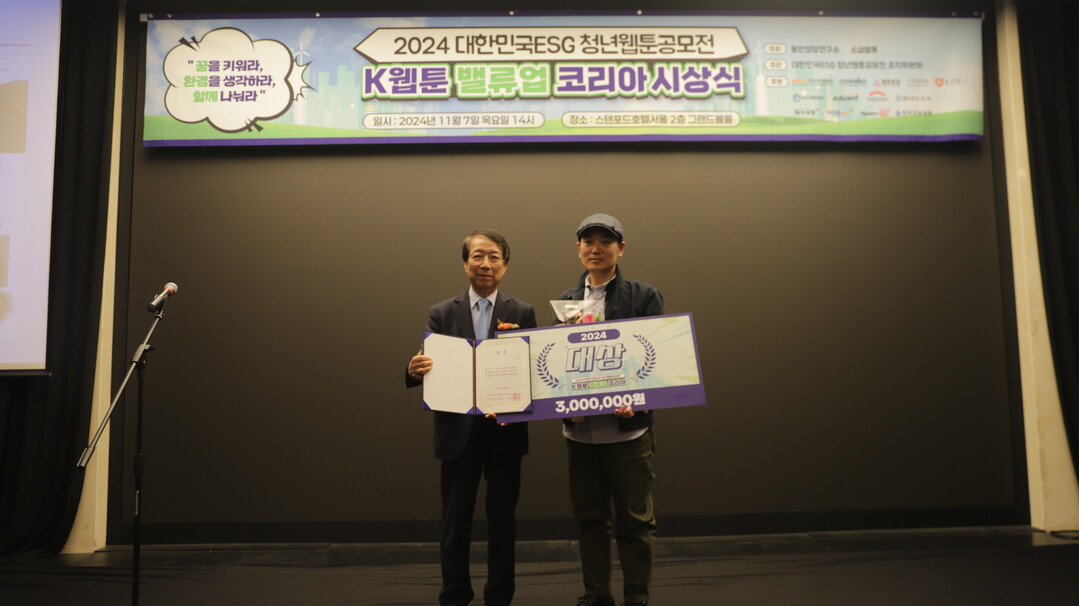 | 7일 오후 2시 서울 상암 스탠포드호텔에서 열린 ‘제1회 2024 대한민국 ESG 청년웹툰 공모전’ 시상식에서 정운찬 동반성장연구소 이사장과 고철민 대상 수상자가 기념촬영을 하고 있다. |