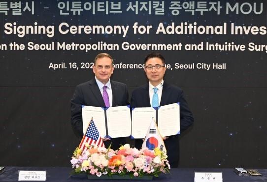 서울시는 16일 시청 본관 간담회장에서 미(美) 수술 로봇 기업 인튜이티브 서지컬과 150억원의 증액 투자 및 신규 고용 등을 내용으로 한 양해각서(MOU)를 체결했다고 밝혔다.