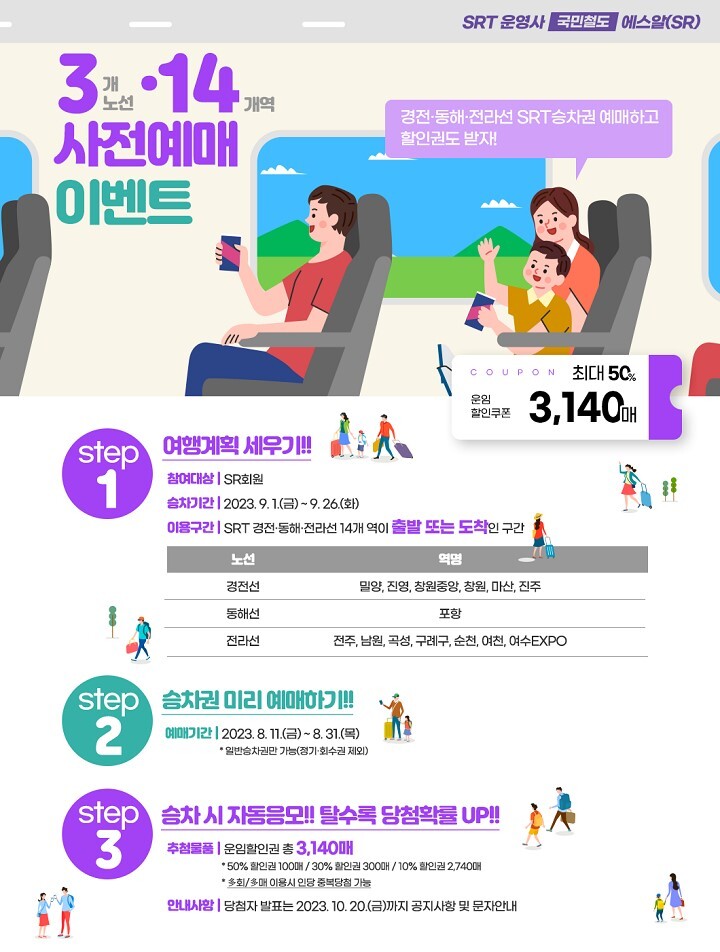 에스알은 이벤트 참여자를 추첨해 SRT를 최대 50% 할인받을 수 있는 운임할인권 100장 등 총 3140장의 할인권을 증정한다. 할인권은 오는 10월 중 지급할 예정이다.