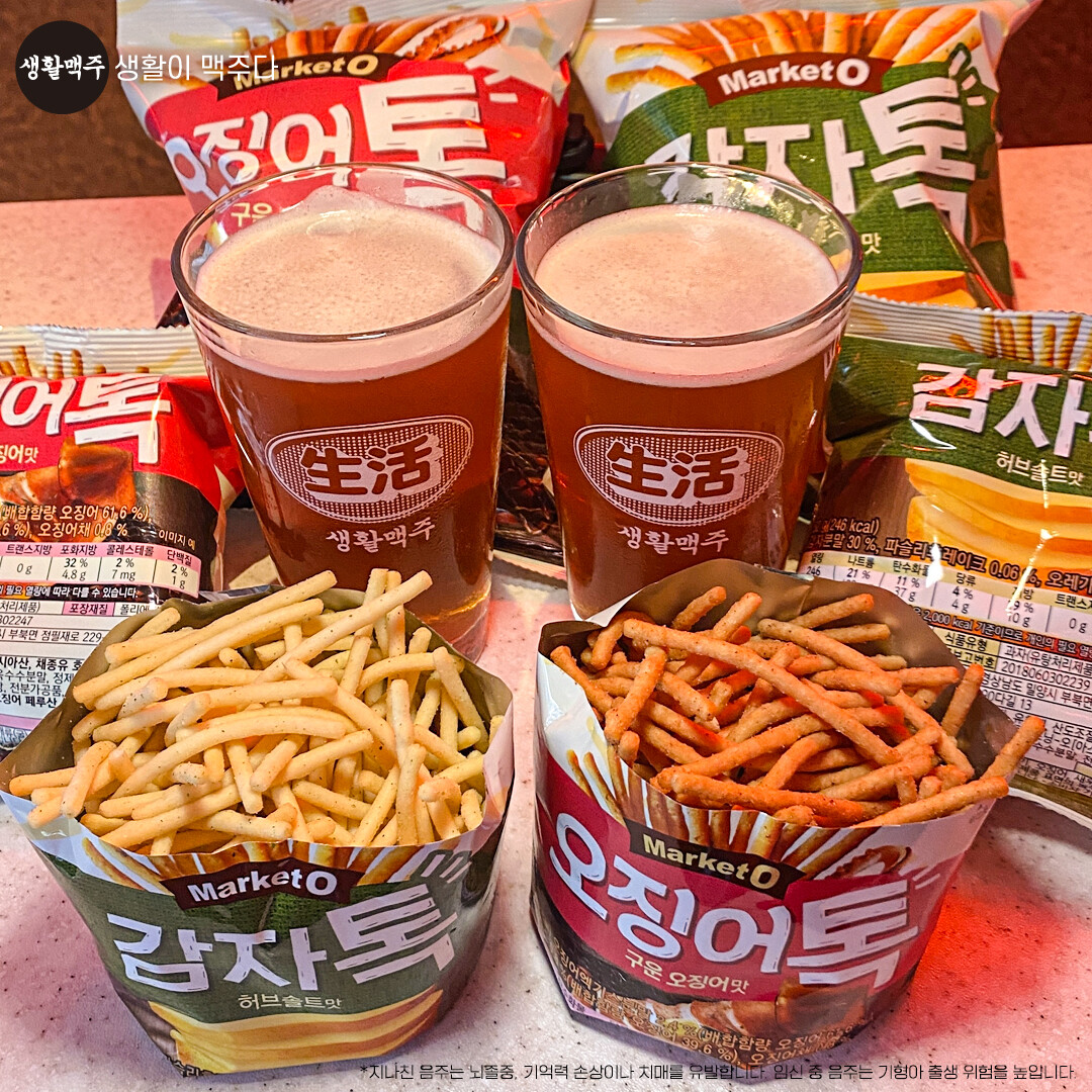 이벤트는 생활맥주의 40여 직영점에서 ‘감자톡 허브솔트’와 ‘오징어톡’ 2종을 기본 안주로 제공하고, SNS에 해시태그와 함께 인증샷을 업로드하면 추첨으로 마켓오 톡스낵 1박스를 증정한다.