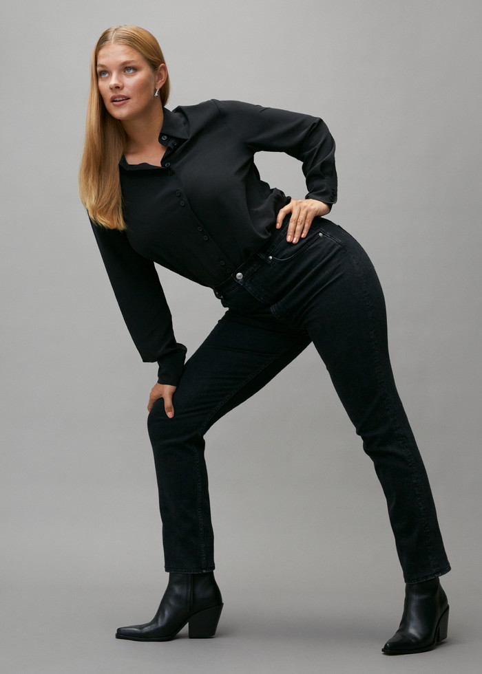 두번째 스타일은 슬림핏의 뮤즈(MUSE)컷 데님이다. 엑스트라 하이 웨이스트와 발목에 충분히 길게 떨어지는 길이감으로 스타일링에 따라 완전히 다른 분위기를 연출할 수 있는 락스타 스타일의 데님이다. 심플하게 스타일링해도 충분히 멋있지만 깔끔한 블레이저나 펌프스로 분위기에 변화를 주면 또 다른 느낌을 연출할 수 있다.