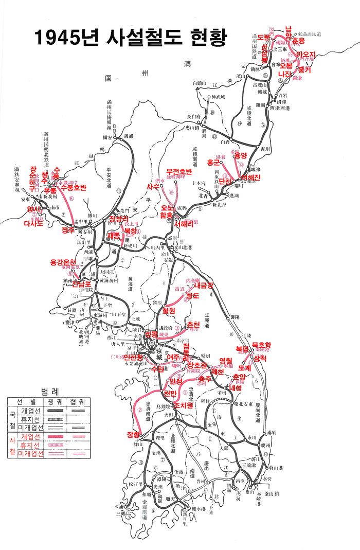 신안주~천동 간의 개천철도사가 있었고, 회령~동관진 간의 도문철도사는 1929년 4월 국철이 매수하였으며, 철원~내금강 간의 전기철도를 운영한 금강산전기철도사, 천안~장항 간 충남선 및 천안~장호원 간의 경기선 철도를 부설하여 운영한 조선경남철도사, 순천~여수 및 순천~광주 간의 남조선철도사, 용담~천내리 간의 천내리철도사는 1927년11월 국유화되었고, 나진~훈융 간의 북선철도사, 회령~금동 간의 북선흥업철도사, 성동~춘천 간의 경춘철도사 등의 사설철도회사가 운영되었다.