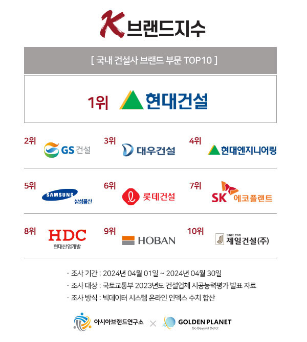 아시아브랜드연구소와 골든플래닛이 자체 개발한 빅데이터 시스템을 통해 산출된 건설사 부문은 2024년 4월 1일부터 30일까지의 온라인 빅데이터를 기반으로 분석한 결과이다.