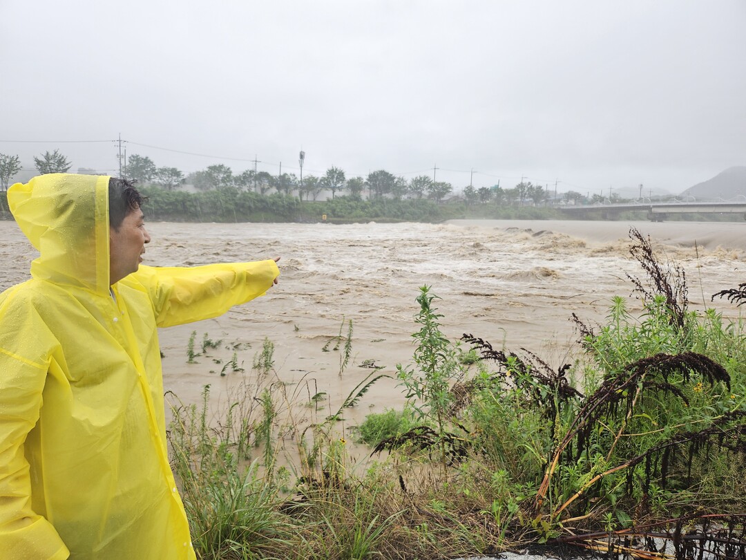 | 김택성 전북위원회 총괄 위원장이 임실군 주변 한천 범람 위기 지역을 돌아보고 있다.(사진 = 이수준 기자) |