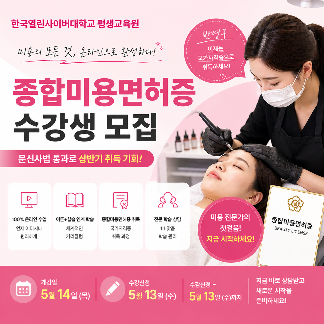 [HBN뉴스=정동환 기자] 뷰티 분야 진출을 준비하는 이들 사이에서 '종합미용면허증'에 대한 수요가 꾸준히 이어지고 있는 가운데, 한국열린사이버대학교 평생교육원이 해당 과정의 5월 개강반 수강생을 모집한다.