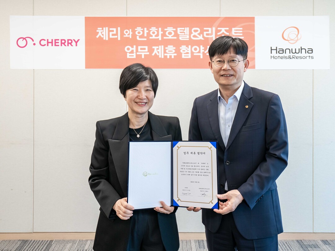 | 이수정 체리 대표이사(왼쪽)와 김형조 한화호텔앤드리조트 대표이사가 협약식 후 기념촬영을 하고 있다. [사진=한화호텔앤드리조트] |