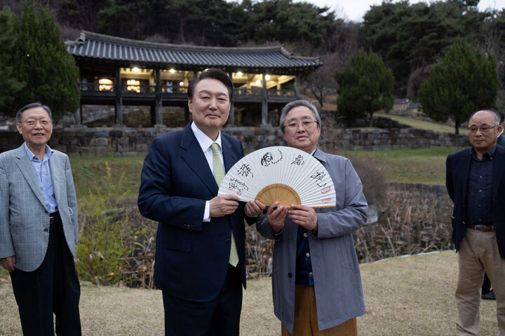 | 지난 2일 윤석열 대통령이 파평 윤씨 종학당을 방문해 윤두식 종회장으로부터 인간문화재 이기동 선생의 부채를 선물받고 있다. [사진=대통령실] |