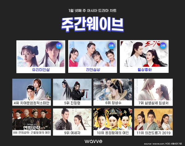 한편, 주간웨이브 아시아드라마 차트에 꾸준히 이름을 올리는 '연희공략: 건륭황제의 여인' 역시 이번 주 8위에 올라 궁중 암투극의 인기를 끌어오는 데 한몫 해낸 것으로 해석된다. 중국 현지에서 국민드라마로 불리는 두 작품의 순위 상승이 다음 주에도 이루어질 수 있을지 귀추가 주목된다.