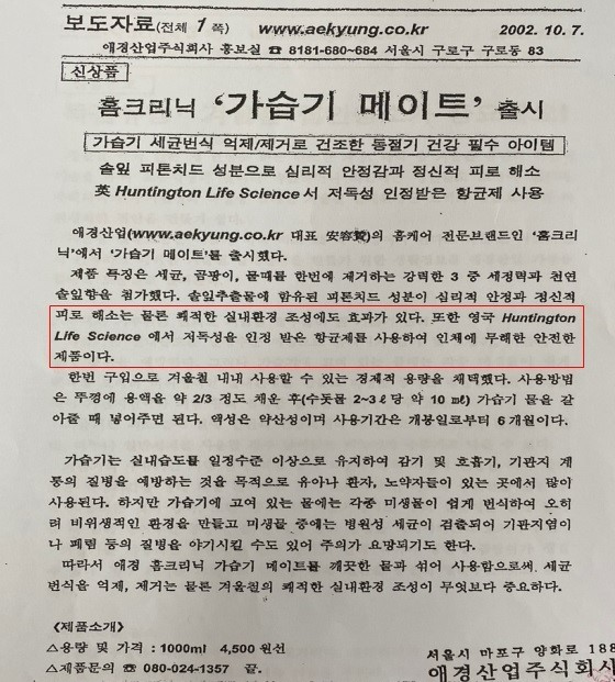 애경은 2002년 10월과 2005년 10월 신제품에 대해 ‘인체에 무해한 항균제를 사용한 것이 특징’ ‘인체에 안전한 성분으로 온 가족의 건강을 돕는다’ 등의 내용을 담은 보도자료를 배포했고, 인터넷신문 기사를 통해 소비자들에게 전달됐다.