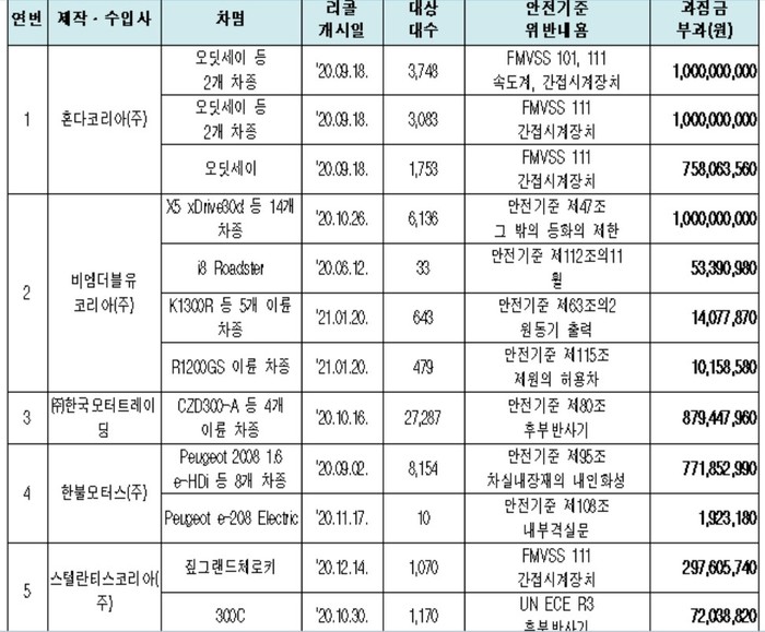 비엠더블유코리아는 X5 xDrive30d 등 14개 차종 6136대에 안전기준에 규정되지 아니한 등화 설치로 과징금 10억원, ▶i8 Roadster 33대의 휠 표기가 안전기준에 부적합하여 과징금 53백만원, ▶K1300R 등 5개 이륜 차종 643대의 원동기 출력 제원이 실측값과 달라 과징금 14백만원, ▶R1200GS 이륜 차종 479대의 축간거리 제원이 실측값과 달라 과징금 10백만 원을 각각 부과한다.