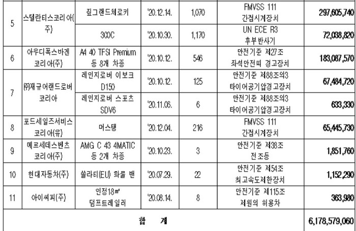 스텔란티스코리아는 짚그랜드체로키 1070대의 후방카메라 영상이 후진 기어에서 다른 기어로 변경 시 10초 이내에 꺼지지 않는 사례가 있어 과징금 2.97억 원, ▶300C 1170대의 후부반사기 반사성능이 안전기준에 부적합해 과징금 72백만원을 각각 부과한다.