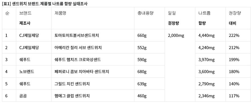 조사결과 나트륨 함량은 CJ제일제당의 ‘토마토 미트볼 서브 샌드위치’가 4440㎎(222%)으로 가장 높았고, 이 회사의 ‘아메리칸 칠리 서브 샌드위치’ 역시 4240㎎(212%)으로 높게 나타났다.