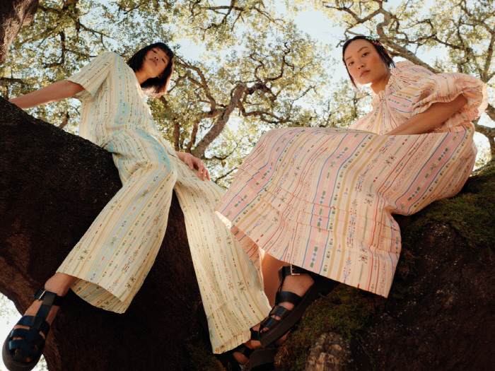 모던하고 조형적인 드레스와 티어드 스커트, 크롭 탱크톱, 플로럴 프린트의 상의와 팬츠 셋업을 포함해 벚꽃 핑크, 모스 그린, 블랙 앤 화이트, 콘플라워 블루와 소프트 옐로가 이번 컬렉션의 주요 컬러다.