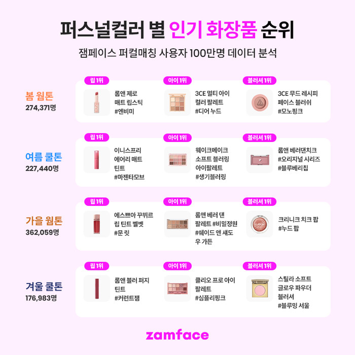 한편, MZ세대의 대표 모바일 뷰티 플랫폼으로 자리잡은 잼페이스는 12만415건 이상의 퍼스널컬러별 매칭 제품 DB를 구축하고, 테스트 결과에 따라 잘 어울리는 뷰티 제품을 추천하고 있다.