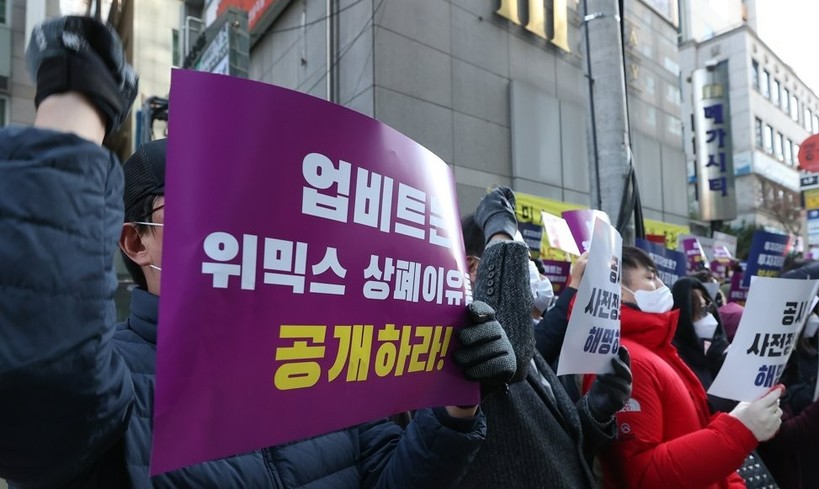 | ▲ 2일 위믹스 사태 피해자 협의체 관계자들이 서울 강남구 소재 업비트 앞에서 기자회견을 열고 상장폐지를 결정한 닥사를 규탄하고 있다. [사진=연합뉴스] |
