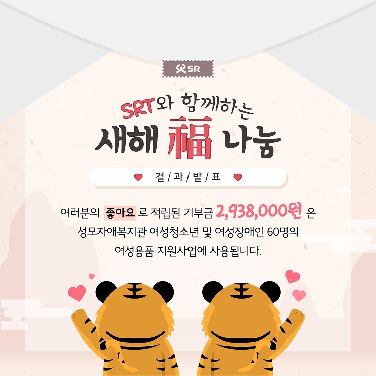 SR은 최근 SR 인스타그램에서 ‘SRT와 함께하는 나눔 이벤트’를 통해 게시물 좋아요 1개당 2천원을 적립하는 방식으로 여성 취약계층을 위한 지원금을 모금했다.