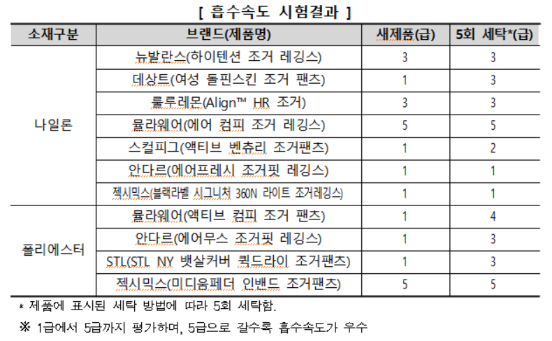 땀을 빠르게 흡수하는 성능인 흡수속도 평가의 경우 새제품 상태일 때와 5회 세탁 후에 각각 측정한 결과 뮬라웨어(에어 컴피 조거 레깅스), 젝시믹스(미디움페더 인밴드 조거팬츠) 2개 제품은 세탁 전‧후 모두 땀을 흡수하는 속도가 빨랐다.