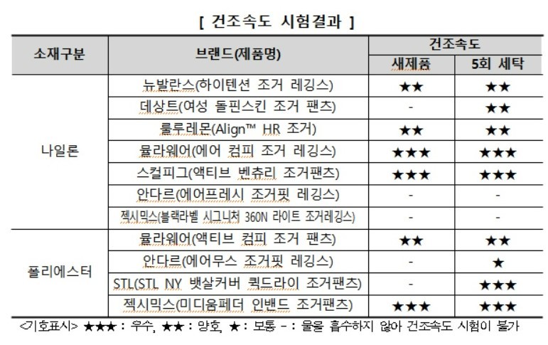 땀이나 물이 건조되는 속도인 건조속도는 뮬라웨어(에어 컴피 조거 레깅스), 스컬피그(액티브 벤츄리 조거팬츠), 젝시믹스(미디움페더 인밴드 조거팬츠) 3개 제품이 세탁 전‧후 상대적으로 빨리 건조돼 우수했다.