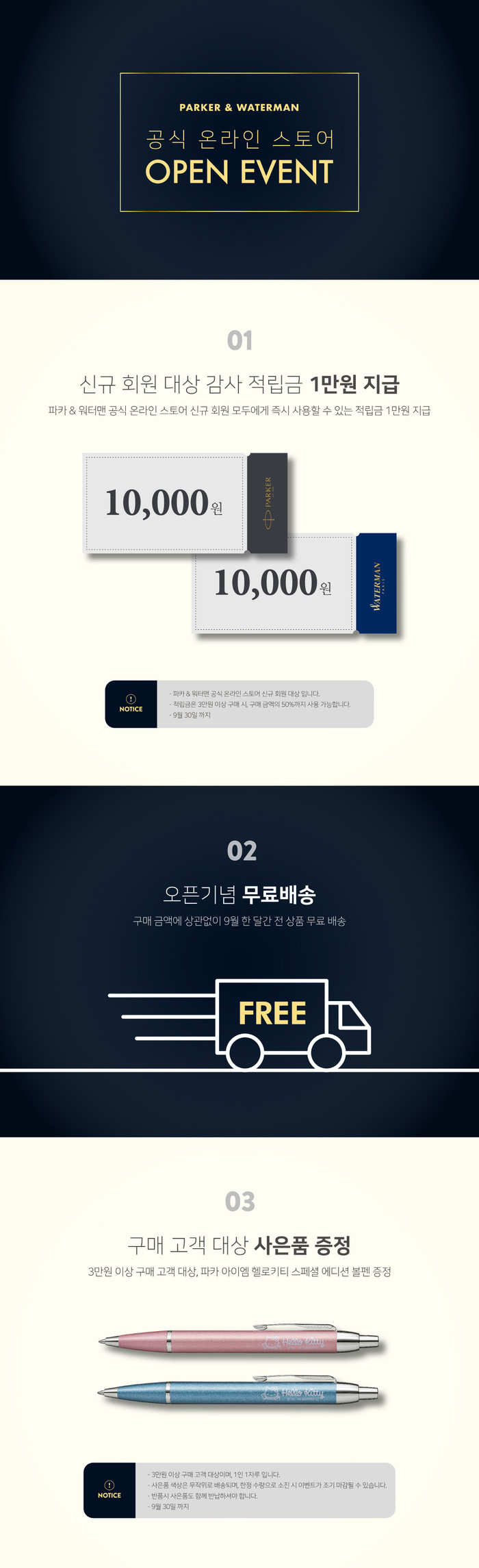 먼저 3만 원 이상 구매 고객을 대상으로 파카 ‘아이엠 헬로키티 스페셜 에디션 볼펜’을 증정하고, 더불어 신규 회원 가입자에게는 즉시 사용 가능한 감사 적립금 1만 원을 지급한다. 또한 구매 금액 상관없이 9월 한 달간 전 상품 무료 배송 혜택도 제공할 예정이다.
