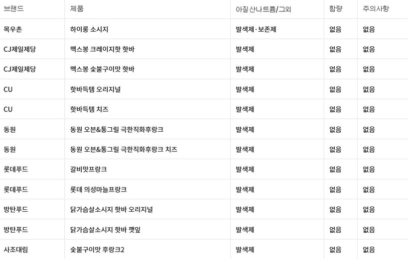 하지만 아질산나트륨 섭취에 대한 위험이나 주의문구, 함량에 대해서는 18개 제품 모두가 표기하지 않았다. 이에 소비자는 아질산나트륨이 첨가된 사실을 모른 채 핫바를 구매해 먹고 있는 상황이다.