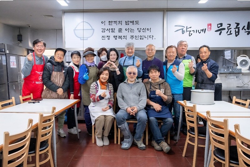 | △사진=지난 17일 경기도 부천 송내 향기네무료급식소에서 봉사를 마무리하고 기념 촬영을 하고 있다. |