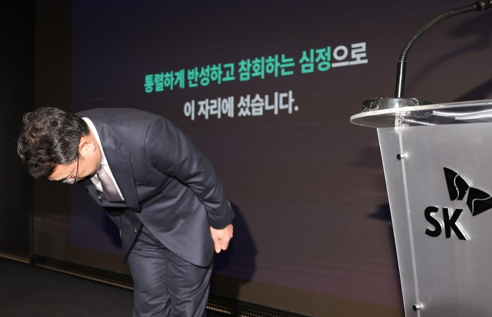 | 유영상 SKT 대표이사가 해킹 사태 관련해 기자회견 후 고개 숙여 사과하고 있다. [사진=연합뉴스] |
