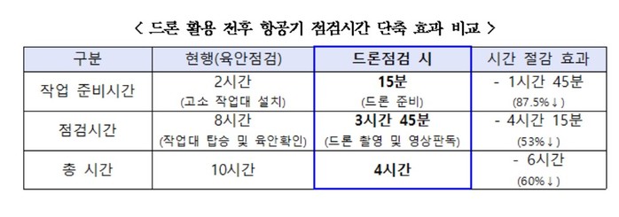 | ▲드론 활용 전후 항공기 점검시간 단축 효과 비교 |