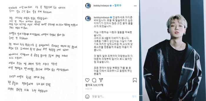 "모든 면에서 한참 부족한 저를 늘 온 마음 다해서 도와주시고 응원해 주신 분들께 마음의 짐을 얹어드리게 된 것 같아서 무거운 책임감을 느낀다"는 바비는 "무엇보다 아이콘의 활동을 기다려 주시는 팬 분들과 멤버들에게 누가 되지 않도록 더욱더 최선을 다해 노력하겠다"고 강조했다.