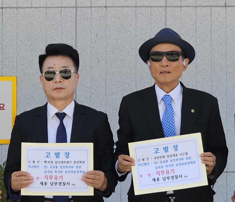 한편 이들 단체는 집회에 앞서 조규홍 전 보건복지부 장관과 김국일 보건의료정책관을 직무유기 혐의로 세종남부경찰서에 고발했다. 고발장에 따르면 이들은 Y병원 K원장의 대리수술(?)과 진료기록부 허위작성(?) 등 의료법 위반 혐의에 대해 적절한 조치 없이 행정조사를 부실하게 수행하거나 방기해 공중보건과 국민 건강을 심각하게 위협했다고 주장했다. 고발인은 "보건복지부 장관과 정책관은 의료법 제59조에 따라 필요한 지도 및 명령을 할 의무가 있음에도 수만 건에 달하는 수술 내역에 대해 실질적 조사를 하지 않았다"며 "이는 명백한 직무유기"라고 밝혔다.