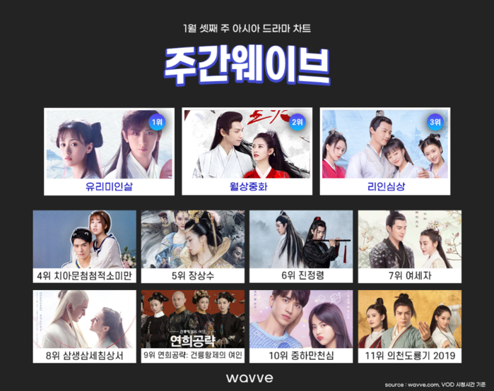 '유리미인살'은 중국 현지에서 최근 종영한 최신작으로, 전생의 비밀을 간직한 채 다시 만난 저선기와 우사봉의 운명적인 이야기를 다룬 작품이다. 총 59부작으로 구성된 '유리미인살'은 현재 웨이브 기준 완결을 앞두고 있다. 완결까지 기세를 이어가 1위 자리를 또 장기간 유지할 수 있을지 도 모른다.