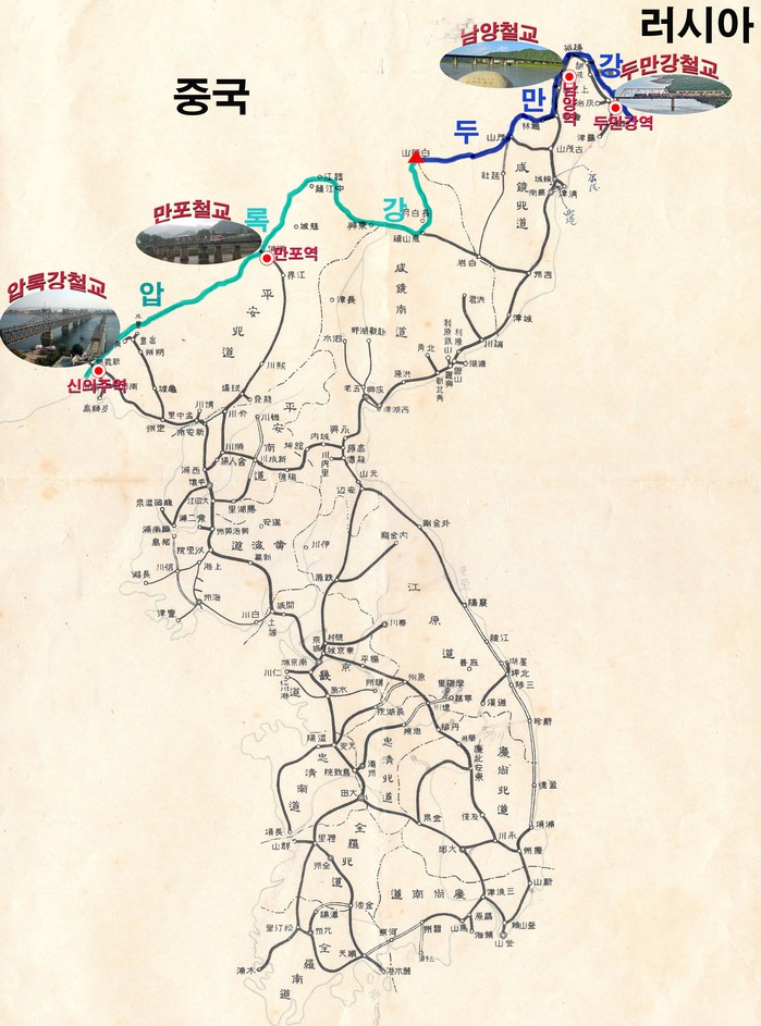 [하비엔=편집국] 한반도 북부 국경에는 두만강과 압록강이 흐르고 있으며, 두 개의 강 건너에는 중국과 러시아가 강을 따라 접하고 있고, 이들 나라와의 국경에는 일제강점기부터 6.25전쟁 때까지 여러 개소에 철교가 부설되어 있어 북한과 중국 및 북한과 러시아간에 상호 열차가 운행되고 있다.
