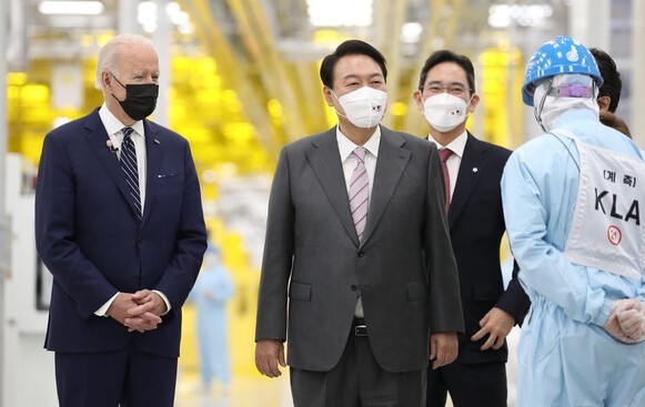 | ▲ 지난달 20일, 삼성전자 평택공장을 방문한 한미 정상을 안내하는 이재용 부회장. [사진=연합뉴스] |
