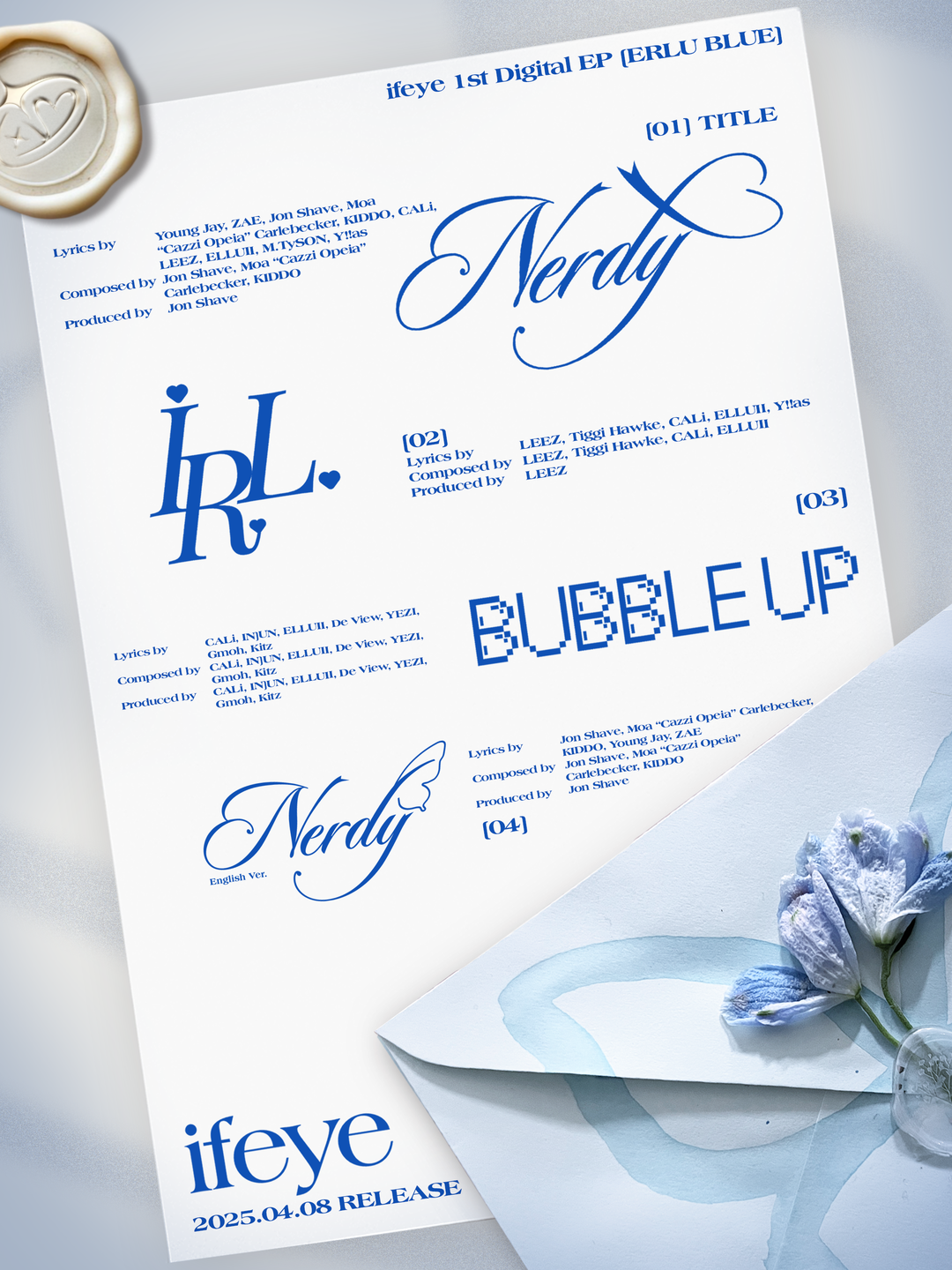 이외에도 꿈에 그리던 이상이 현실에서도 이루어지길 바라는 간절함을 담은 얼터너티브 팝 ‘IRL’, 데뷔의 설렘과 당찬 포부를 녹여낸 힙합 트랙 ‘Bubble Up(버블 업)’ 그리고 타이틀곡 ‘NERDY(널디)’의 영어버전까지 총 네 곡이 수록돼 ifeye(이프아이)만의 다채로운 색깔을 예고했다.
