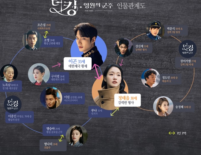 '더킹 영원의 군주' 속 서로 다른 세계의 문은 이림 역의 이정진이 열었다. 이정진은 대한제국에서 이곤, 이민호의 큰 아버지다. 대한민국에서 이정진은 장애인으로 살고 있다. 역시나 이민호의 큰 아버지다. 세계가 다르다는 사실을 안 이정진은 두 세계의 신이 되기로 결심한다.