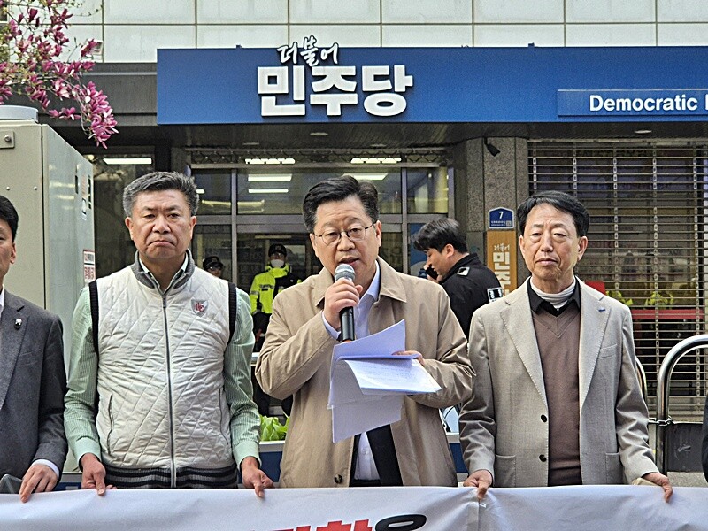 | △사진=안호영 국회의원이 11일 오후 더불어민주당 당사 앞에서 전북도지사 경선과관련해 부당함을 주장하며 기자회견을 하고 있다. [제공/안호영 국회의원실] |