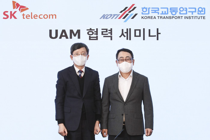지난 24일 SK텔레콤은 한국교통연구원과 UAM 협력을 위한 세미나를 가졌다. SKT 본사 사옥에서 열린 세미나에는 유영상 SKT 대표와 오재학 한국교통연구원장 등 양측 주요 임직원이 참석했다.