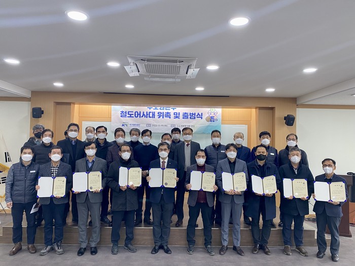 | ▲국가철도공단 손병두 본부장(왼쪽 다섯번째)과 직원들이 15일(화) 수도권본부에서 '철도어사대 출범식'을 개최하고 기념촬영을 하고 있다. |