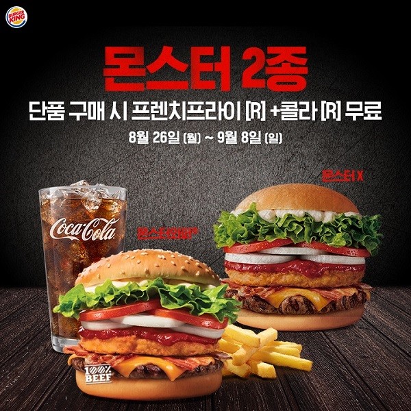 9월 8일까지 버거킹 카카오톡 플러스 친구 대상으로 몬스터와퍼와 몬스터X 2종 단품 구매 시 사용 가능한 세트 업 쿠폰 제공