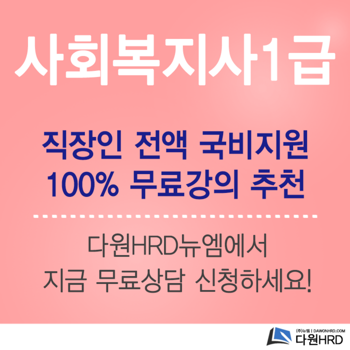 다원HRD뉴엠에서는 근로자(재직자)내일배움카드를 발급받아 사회복지사1급 자격증 직장인 국비지원 수강생을 모집한다.