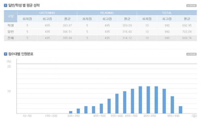 그 이전 토익 시험의 평균 점수를 보면 듣기의 평균은 380.14점, 독해의 평균은 307.39점으로 전체 평균은 687.52점이다.