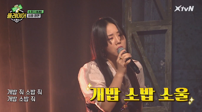 유성은은 ‘개밥 줘 소밥 줘 개밥 소밥 줘. 개가 너무 짖어 대요. 소는 하루종일 배고파서 음메”라는 짧고 굵은 노래를 감성이 담긴 목소리를 불러내 오히려 폭소를 유발했다.