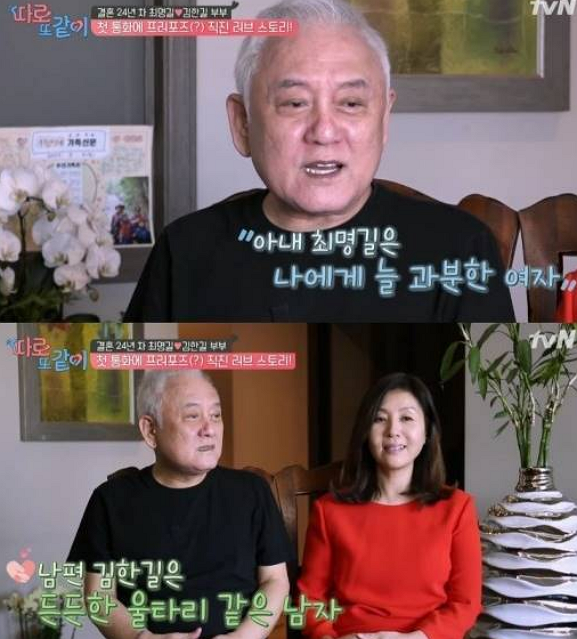 지난해 tvN ‘따로 또 같이’에 출연한 김한길은 최명길에 대해 “내게 과분한 여자다. 난 그렇게 생각한다”며 남다른 애정을 드러냈다.