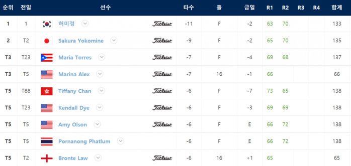 다른 한국 선수들의 lpga 실시간 스코어는 최윤정은 10위, 박인비는 17위, 이미림은 17위의 자리에 올랐다.