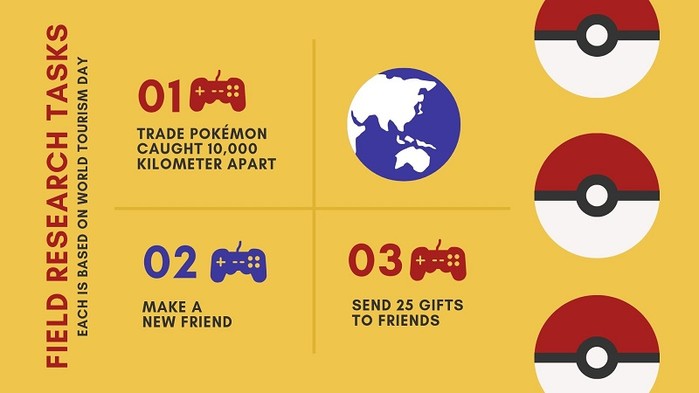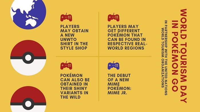 세계 관광의 날은 전 세계 사람들의 여행 정신을 고무시키기 위한 날이다. '포켓몬 고' 또한 플레이어들이 여기저기 돌아다니며 포켓몬을 잡는 게임이기 때문에 포켓몬 컴퍼니와 나이언틱은 플레이어들의 여행 정신을 자극하기 위해 UNWTO와 제휴를 맺고 특별한 이벤트를 진행하기로 결정했다.